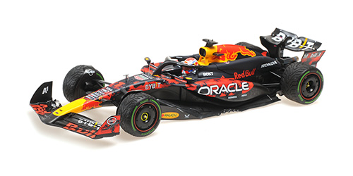 Miniature Minichamps F1 Oracle RedBull Racing RB20 pilotée par Max Verstappen / 2ème du Grand Prix de Grande Bretagne (Circuit de Silverstone) 2024. Livrée spéciale pour le GP + pneus intermédiaires utilisés pendant la course – Édition limitée